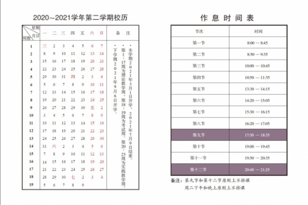 2020-2021学年第二学期校历